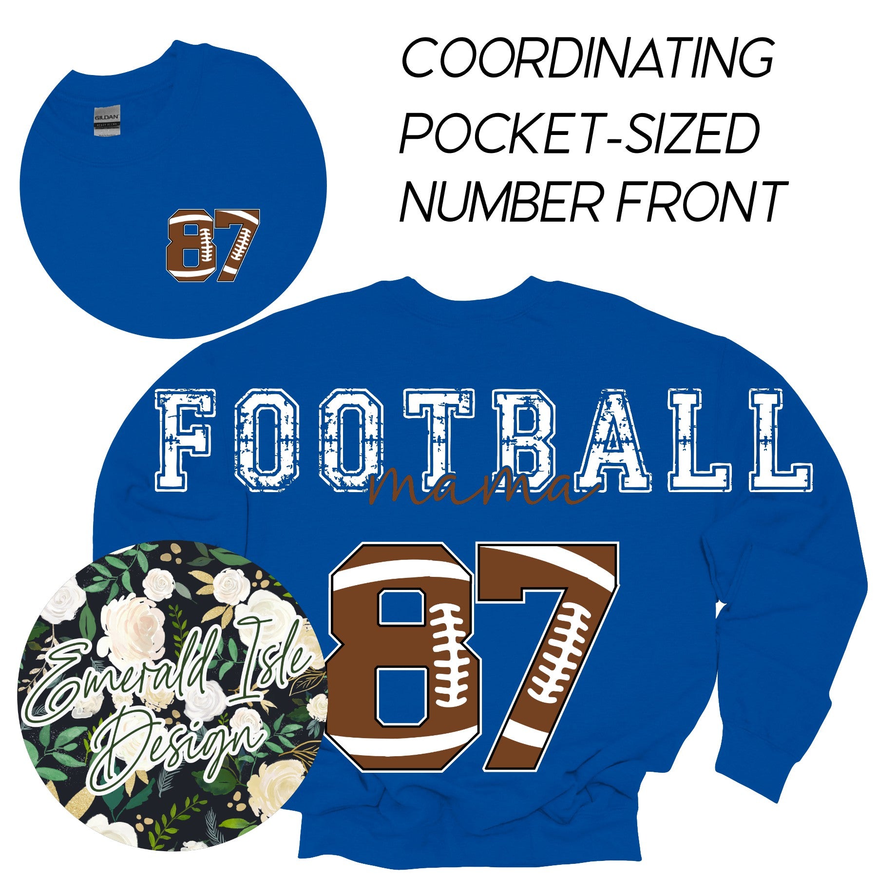 Custom Football Mama Oversized Horizontal Design with Coordinating Pocket-Sized Number Front on Crewnecks or Hoodies