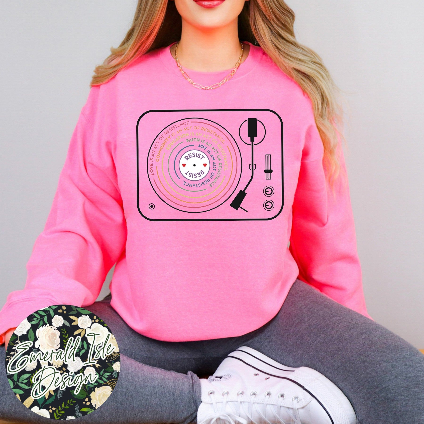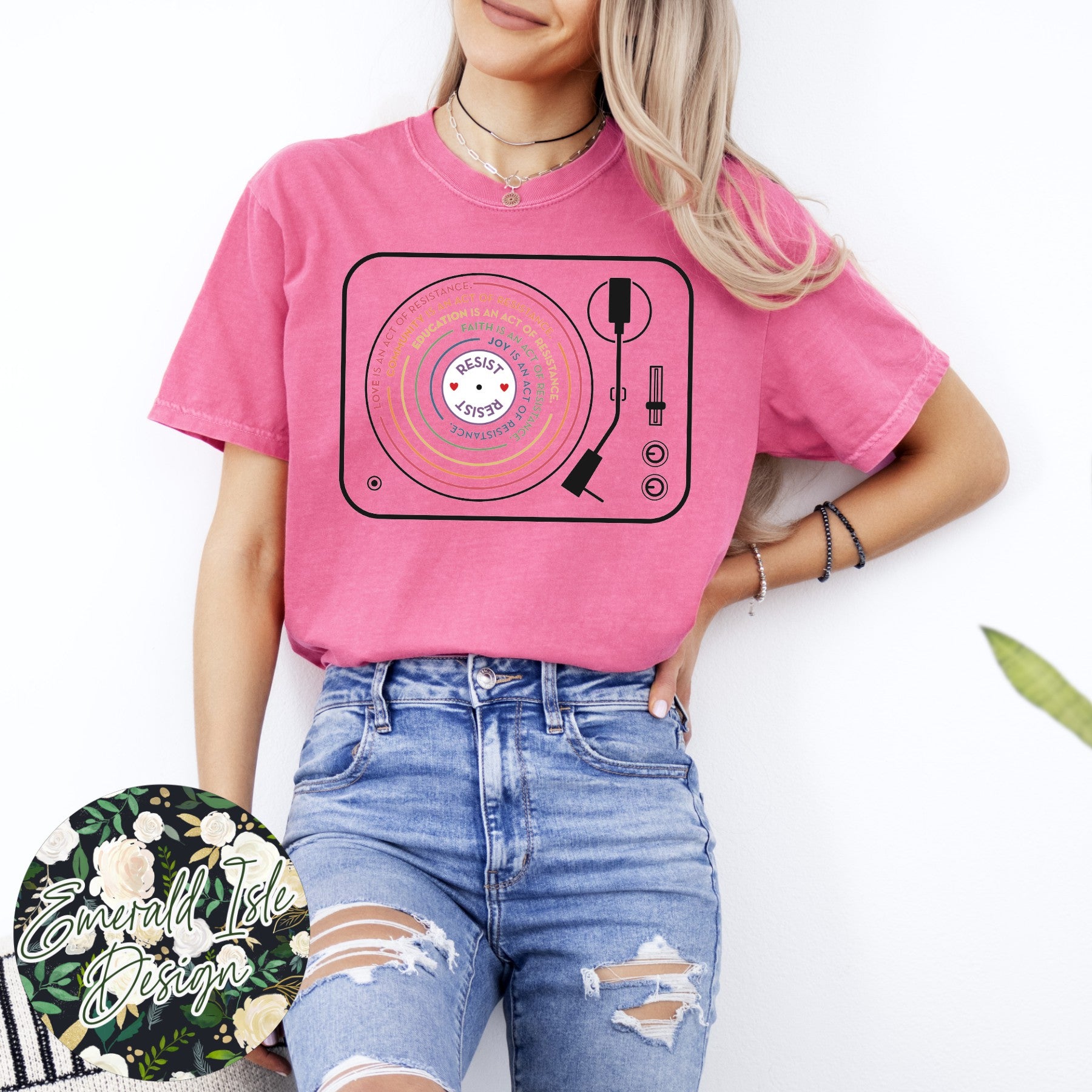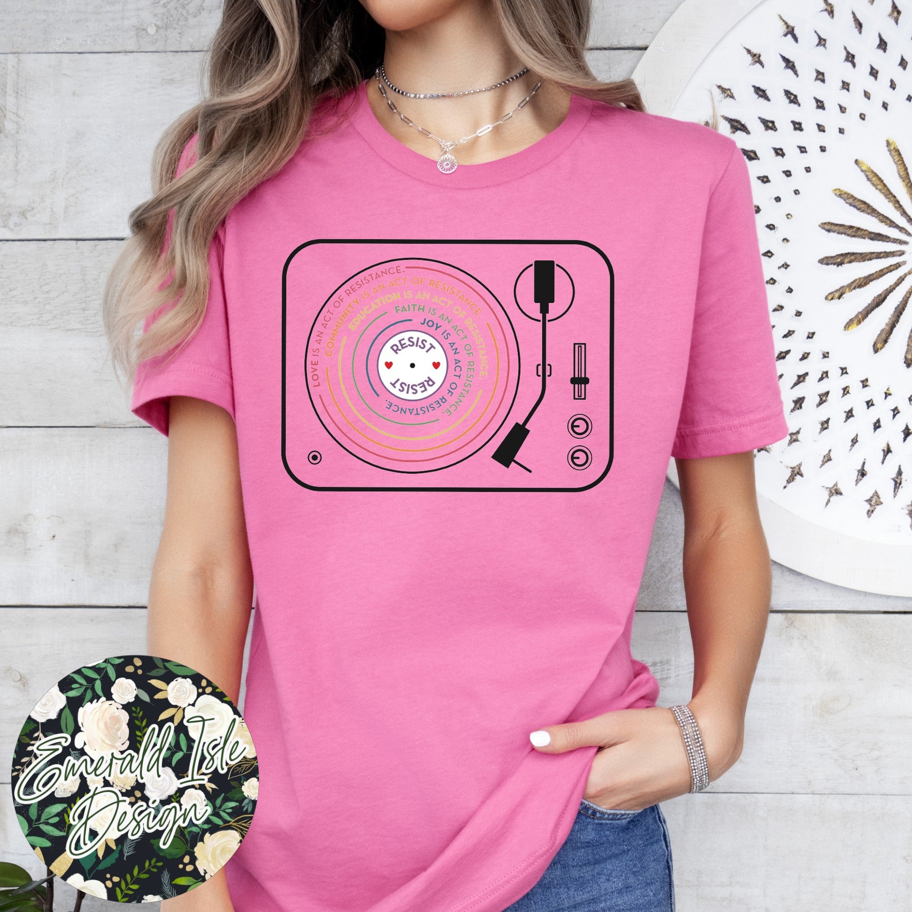 Spin into resistance with this cozy turntable design that doubles as a statement piece. Wrapped in comfort and wrapped in purpose, this playful tee celebrates love, community, education, faith, and joy as powerful acts of defiance. Perfect for music lovers and activists alike who refuse to turn down the volume on what matters. Every purchase supports the ACLU, so you're not just wearing your values—you're funding them. Stay comfy, stay loud, stay resistant.